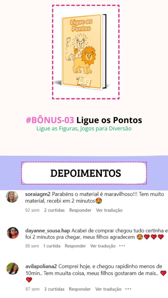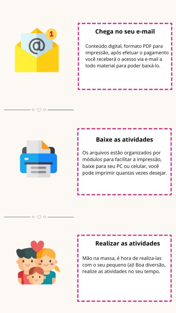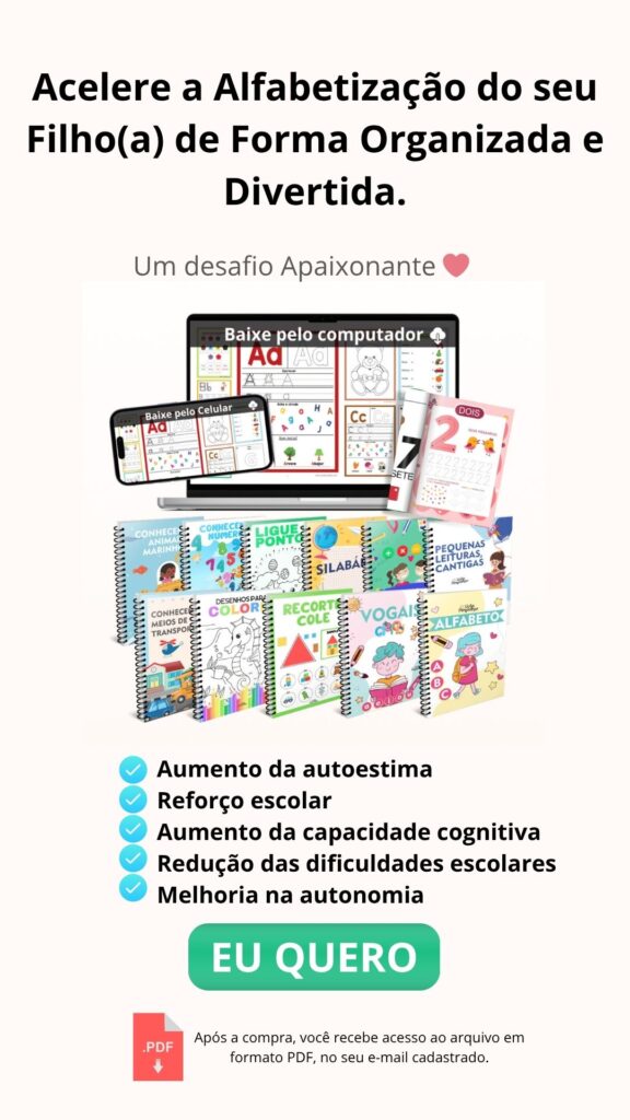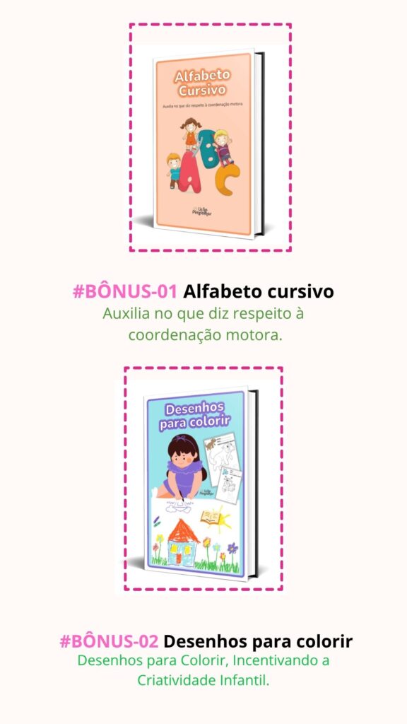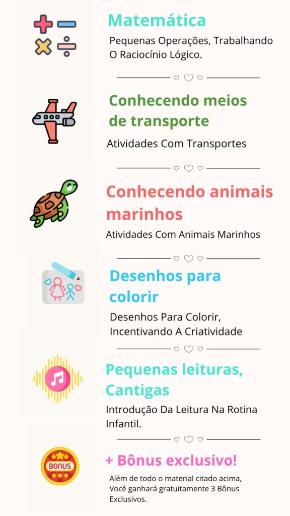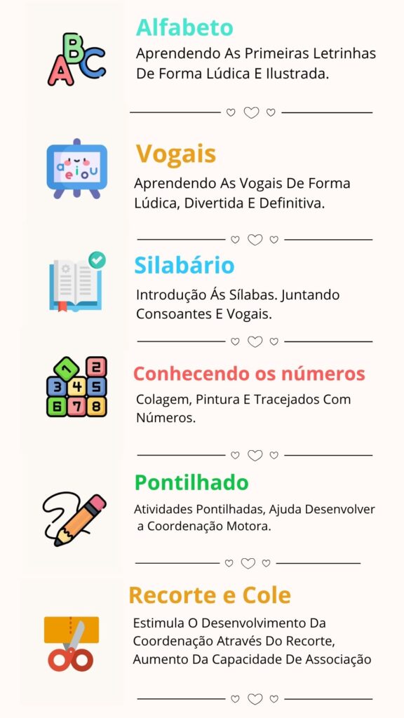 São mais de 1200 atividades entre elas: Alfabeto, vogais, silabário, conhecendo os números, matemática, pontilhados, recorte e cole, desenhos para colorir, conhecendo meios de transportes, conhecendo animais marinhos, mais 3 bônus exclusivos